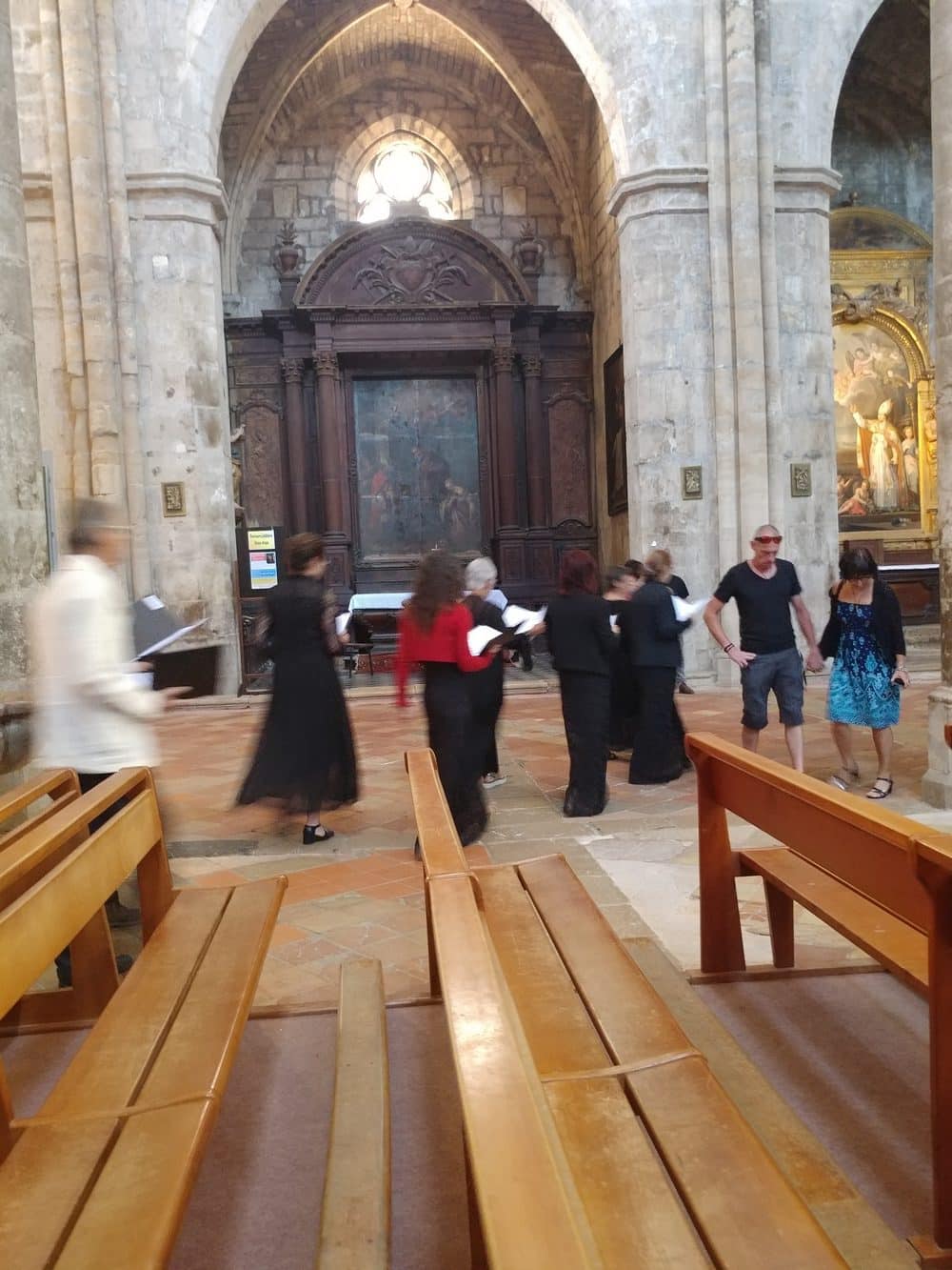 Avec le choeur des Ateliers, nous avons expérimenté le chant sacré en ronde et en déplacement et à notre grande surprise, nous avons constaté que l’acoustique d’un lieu peut être différente selon que les chanteurs soient en mouvement ou soient statiques. L’action de « caroler » transforme le son et le rend plus riche en harmonique, plus long en réverbération, plus profond… L’écoute de la part du public est elle aussi modifiée, rendant inoubliable cette expérience du chant sacré en 3 dimensions.