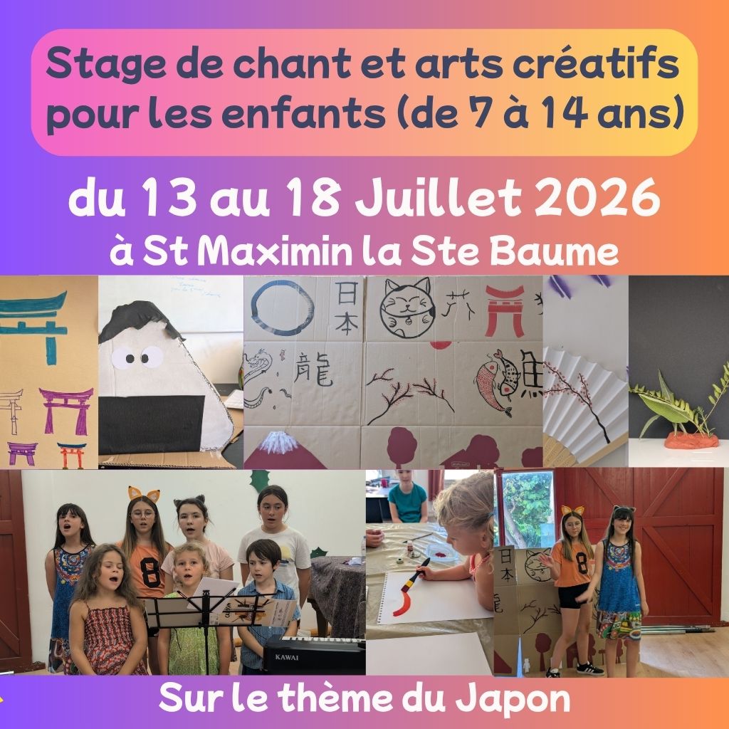 Pour la neuvième année consécutive, nous organisons ce stage en partenariat avec l’école Galilée à St Maximin. Cette année, le thème du spectacle sera le Japon, comme l’année dernière, parce qu’il y a beaucoup beaucoup de formes d’arts à explorer ! Calligraphie, dessin à l’encre, haïkus, création de masques de samurai, origami, dorodango … Ce sera par la même occasion l’opportunité de faire découvrir aux enfants différents aspects de la culture japonaise (cérémonie du thé, Do In, Ikébana – l’art de faire vivre les fleurs…) Nous apprendrons des chansons en français et en japonais pour créer un spectacle inédit en 6 jours ! (Ce ne sera pas le même spectacle que l’année dernière)