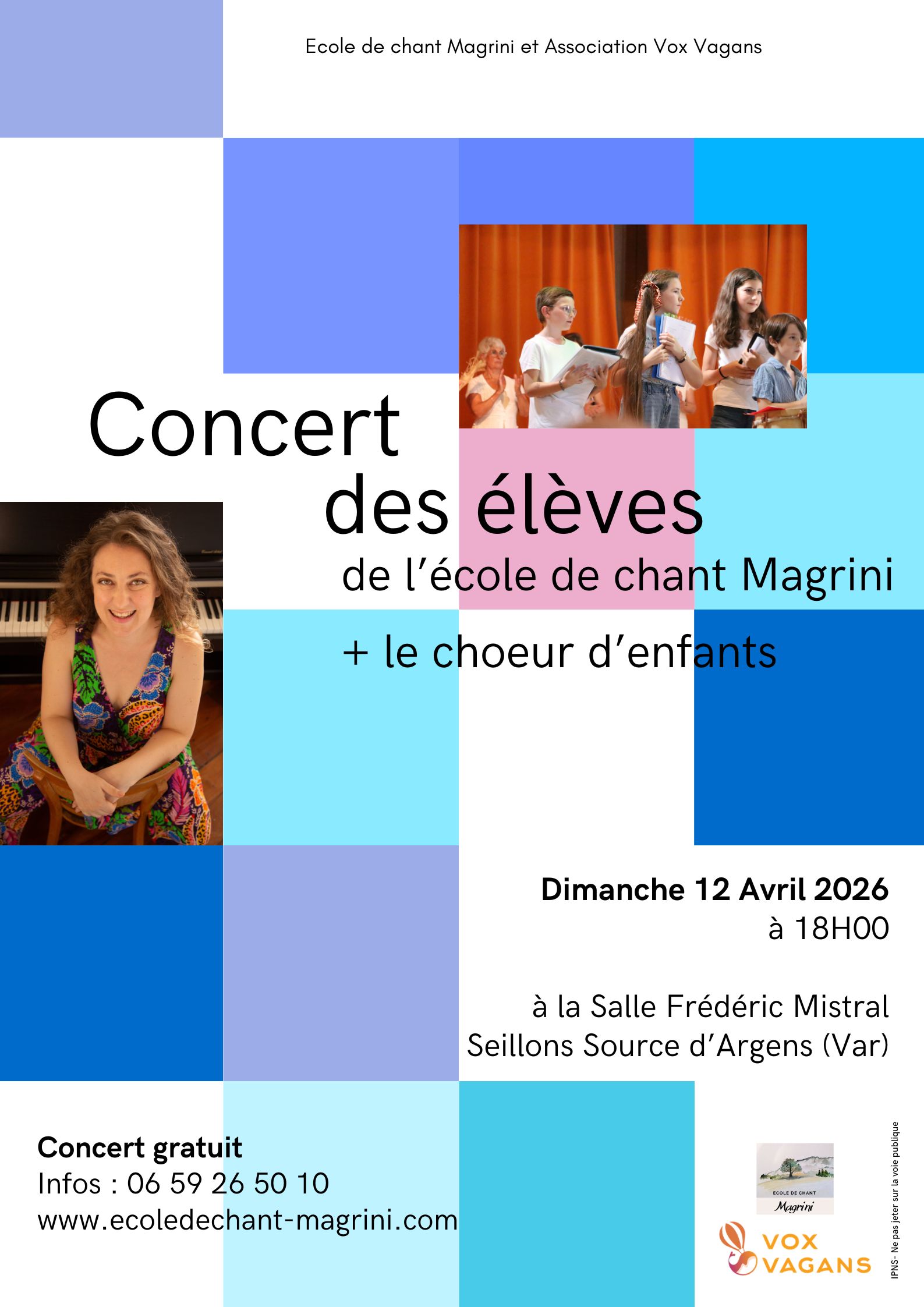 Les concerts de nos élèves jalonnent l’année, c’est important pour eux, pour nous, et ça crée des moments de partages inoubliables ! Je compte sur vous pour venir les écouter, les soutenir et passer un moment magique avec nous. Le choeur d’enfants chantera toute la première partie.